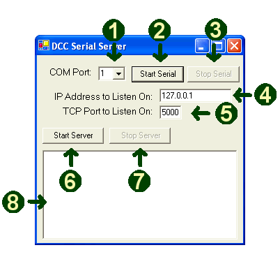 Click on this button to actually start the DCCServer application, when pressed, it will start to listen for DCC packets to process and loop to the booster.